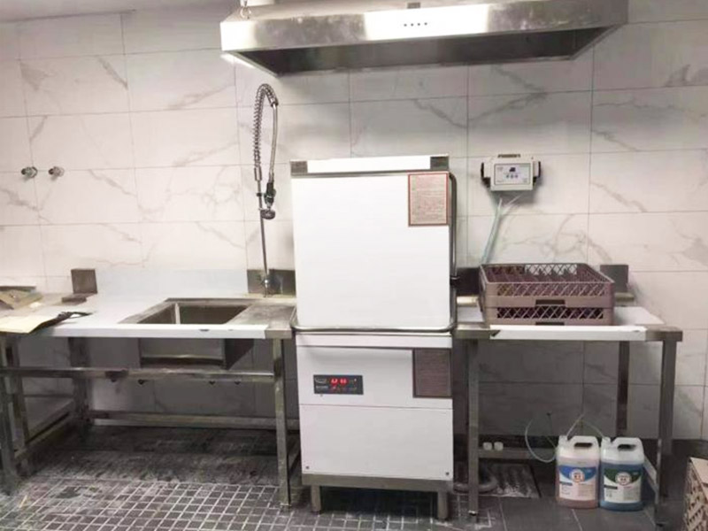 This machine requires pre-rinsing items before loading them into racks for the main wash cycle. Therefore, a pre-rinse sink needs to be equipped beforehand.